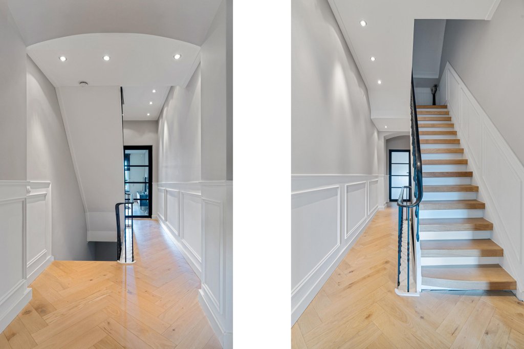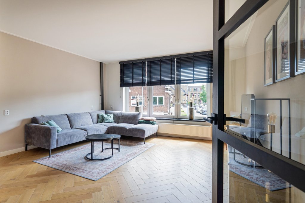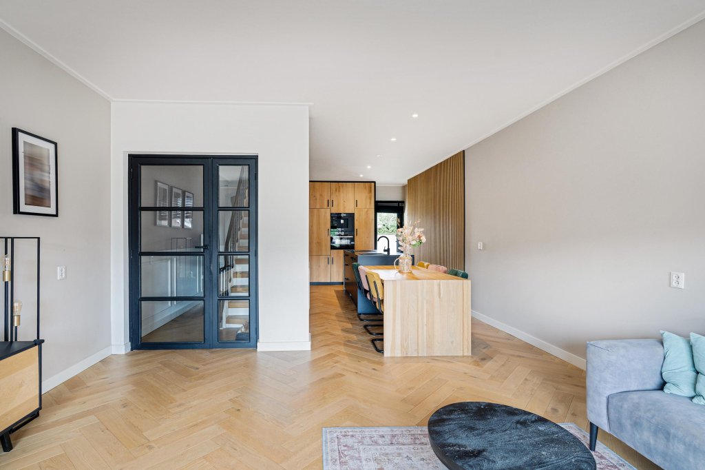 Overloop met glazen deur naar de stijlvolle woonkamer met visgraat parketvloer en veel lichtinval.