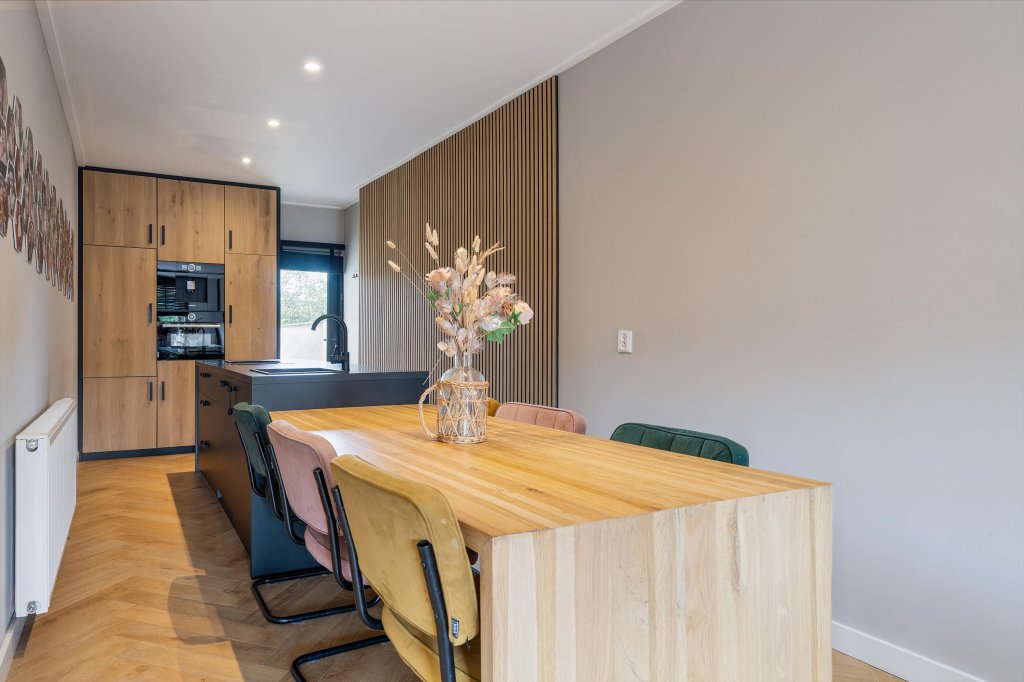4-pits keramische kookplaat met ingebouwde afzuigkap, combimagnetron, inbouw koffiemachine, koelkast en vaatwasser. Via de keuken is het dakterras bereikbaar.