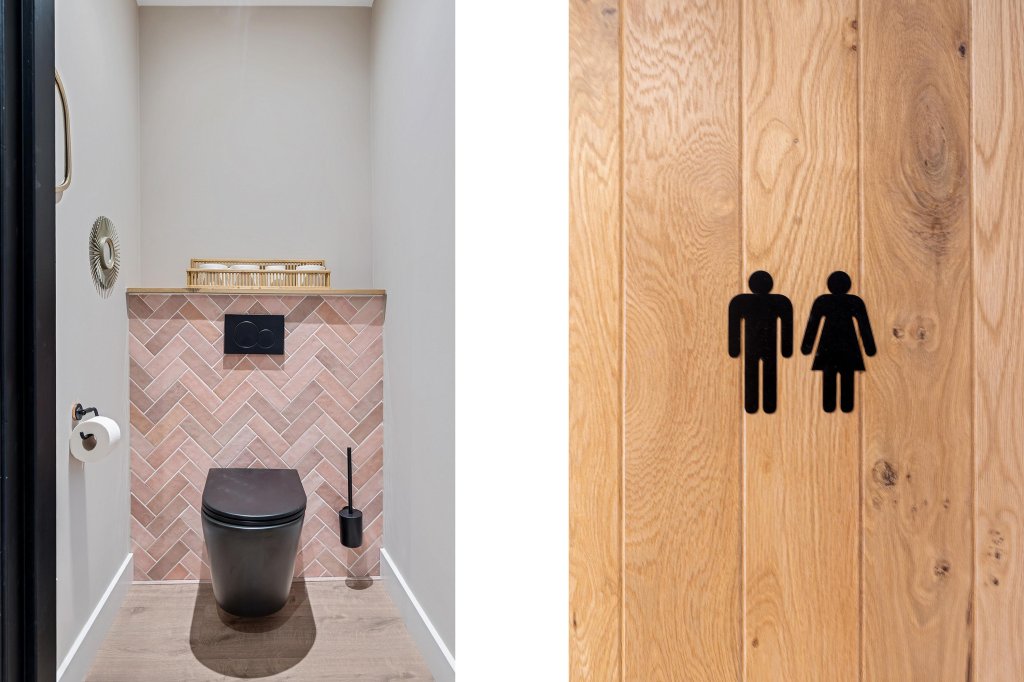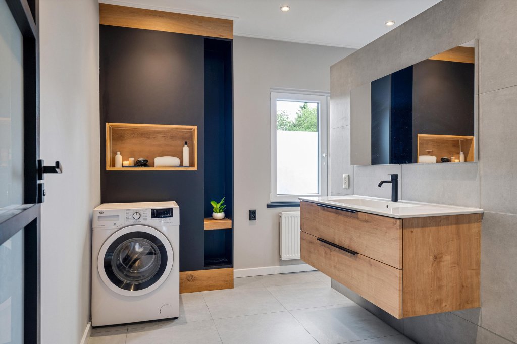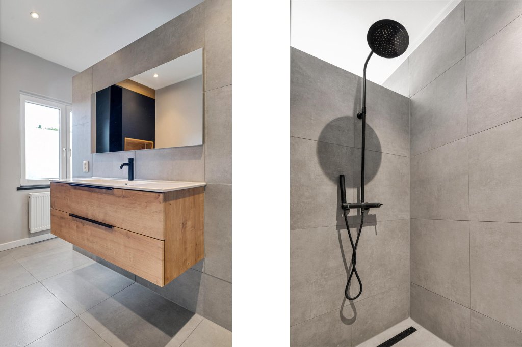 De luxe badkamer is volledig betegeld badkamer en voorzien van een ruime inloopdouche, modern wastafelmeubel en zwevend closet.