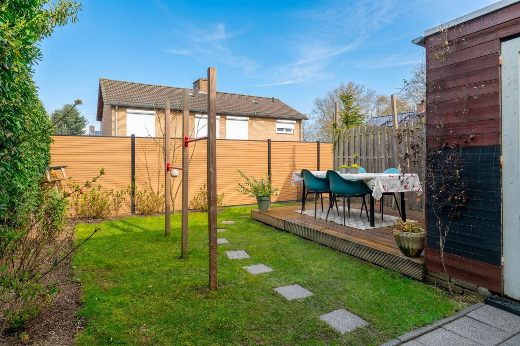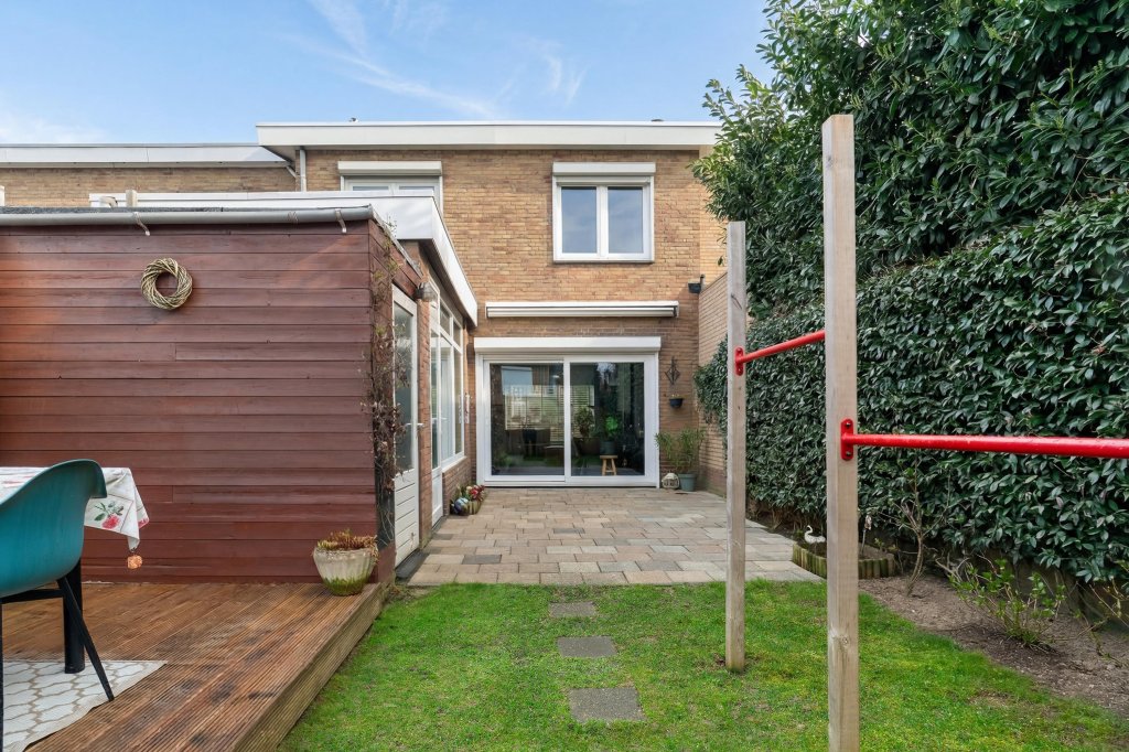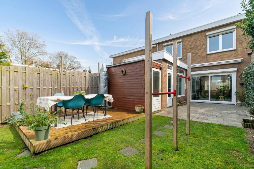De verzorgde, onderhoudsvriendelijke achtertuin beschikt over een houten vlonder met een gezellig zitgedeelte. Daarnaast is er een speeltoestel aanwezig en een aangebouwde berging, ideaal voor extra opslag.