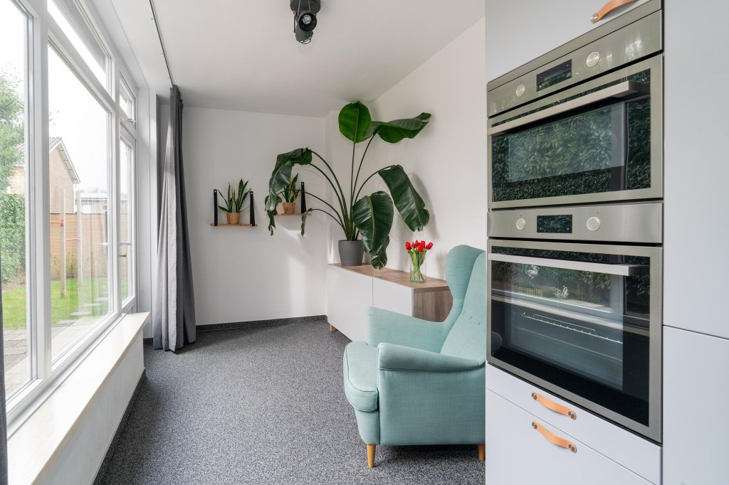 De lichte doorzonwoonkamer met halfopen keuken vormt het hart van de woning. De moderne keuken, deels gelegen in de aanbouw, is uitgerust met diverse inbouwapparatuur zoals een koelkast, diepvries, inductiekookplaat, afzuigkap, combimagnetron en vaatwasser. Vanuit de keuken en woonkamer heeft u direct toegang tot de achtertuin.