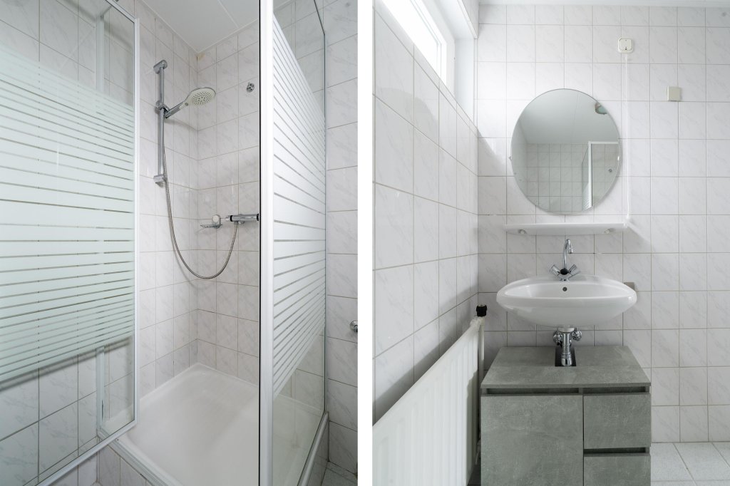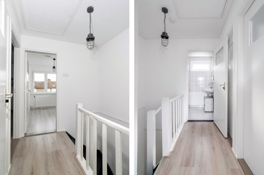 De overloop biedt toegang tot drie slaapkamers en een volledig betegelde badkamer met douche, hangcloset en wastafelmeubel. De doorlopende laminaatvloer zorgt voor een rustige en nette uitstraling.