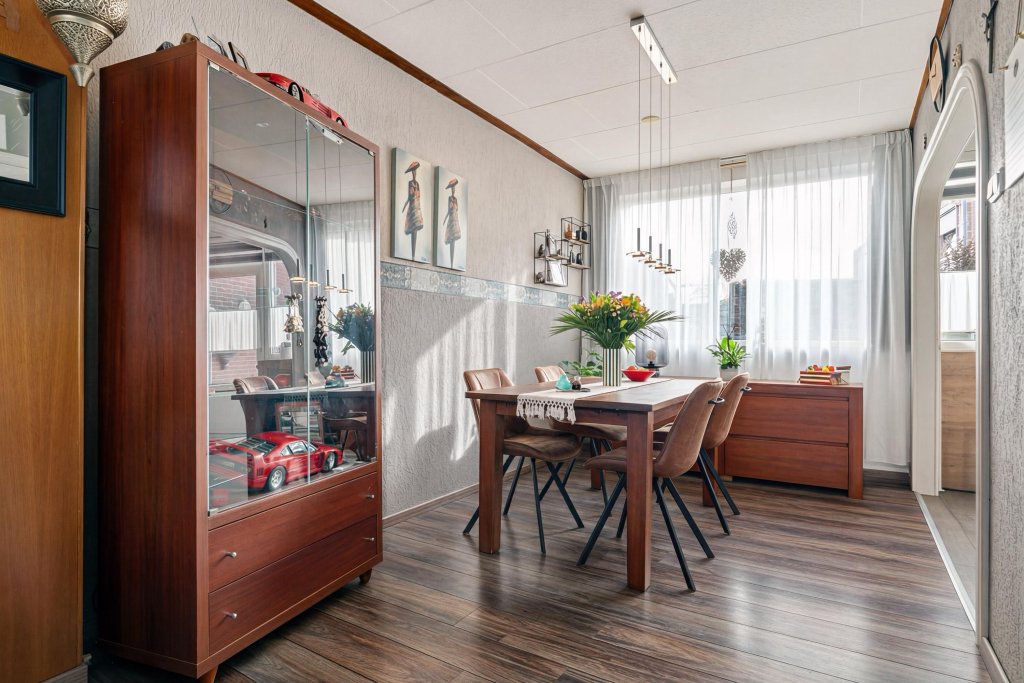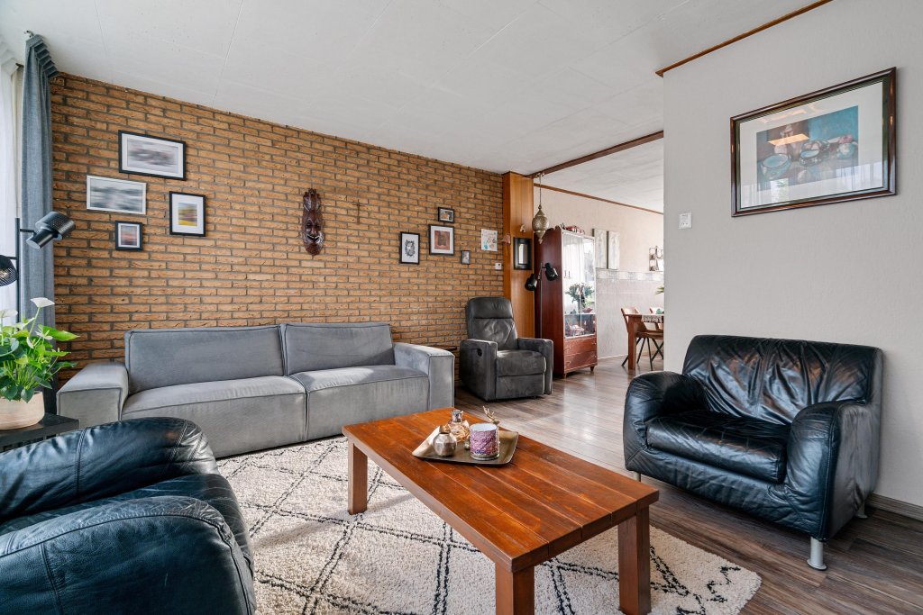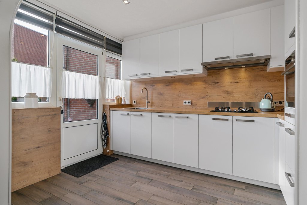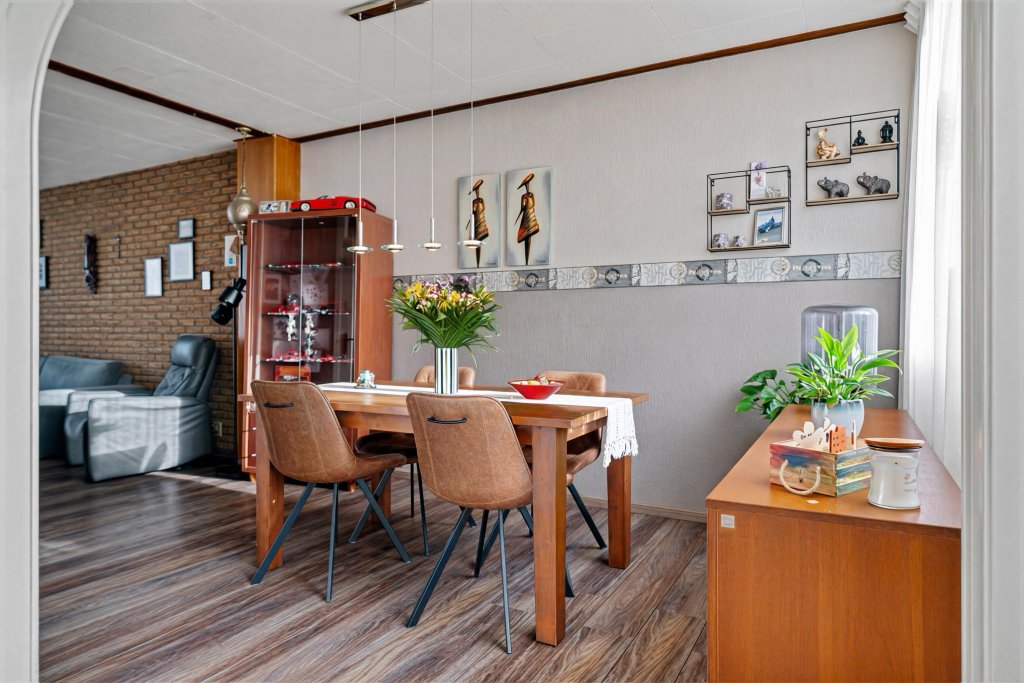 Overloop met toegang tot de living. De doorzonwoonkamer is licht en biedt voldoende ruimte voor een comfortabele zithoek en eethoek voorzien van nette laminaatvloer. Aansluitend bevindt zich de keuken met de navolgende apparatuur: 4-pits gaskookplaat, afzuigkap, koelkast en combi-oven. Vanuit de woonverdieping is er directe toegang tot de tuin middels loopdeur.