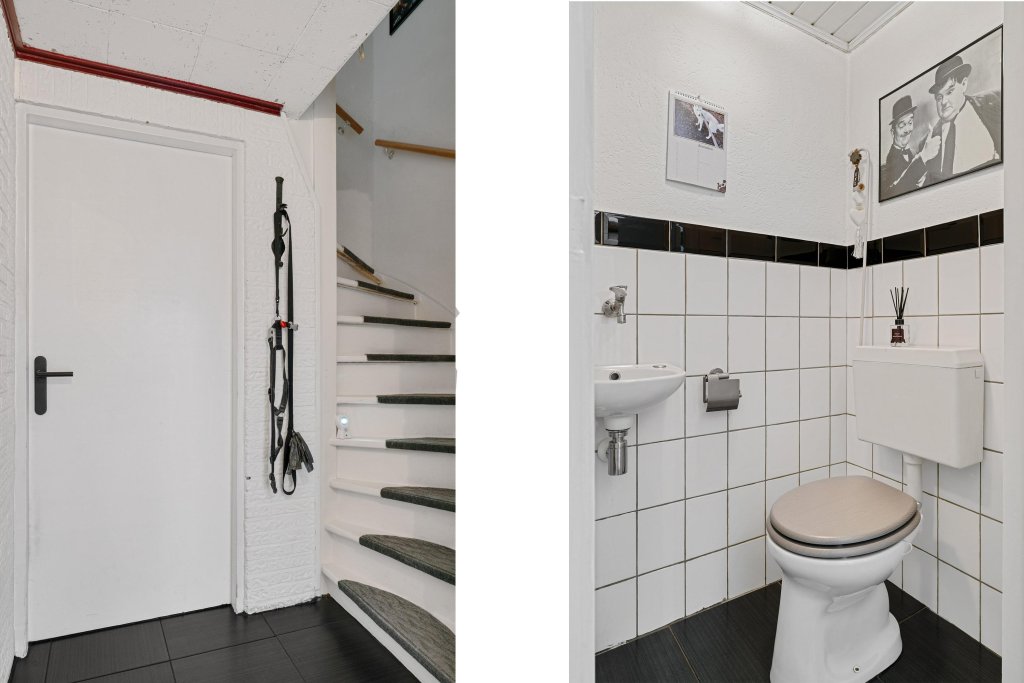 Entree/hal met toegang tot de ruime inpandige garage, toiletruimte, meterkast en trapopgang naar de woonverdieping.