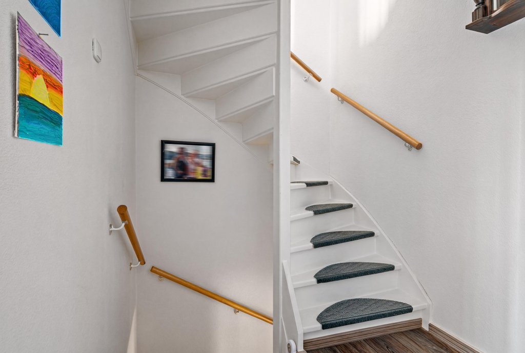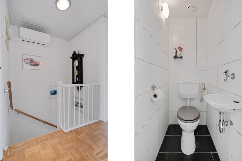 De overloop geeft toegang tot drie slaapkamers, de badkamer, aparte toilet en bergkast.