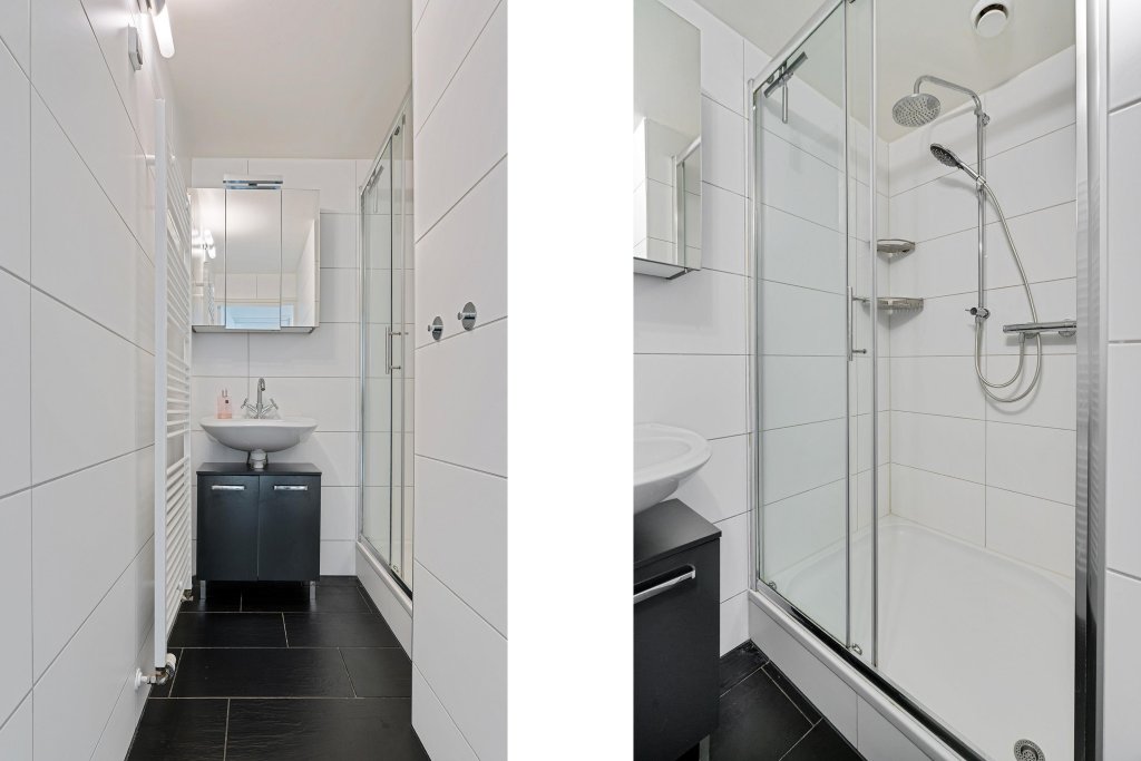 De volledig betegelde badkamer beschikt over een douche en wastafel met meubel. Aparte toiletruimte.