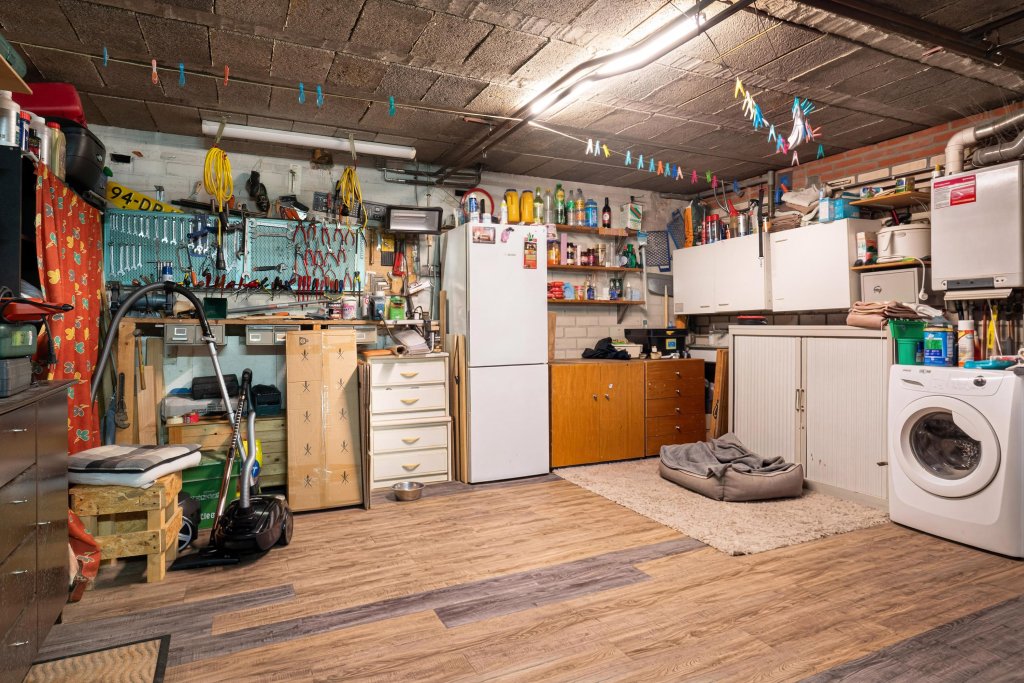 De inpandige garage biedt ruimte voor één auto, extra opslag, stookruimte en wasruimte.