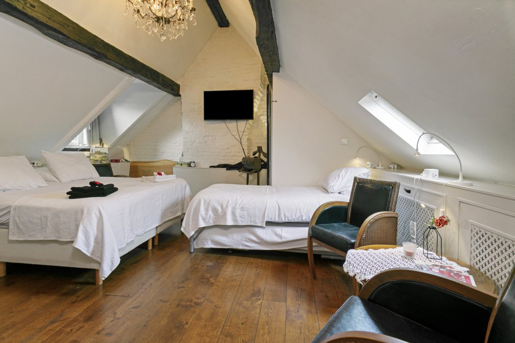 De slaapkamer achter de bibliotheek heeft 2 verdiepingen boven de poortvleugel, alwaar een kantoor ingericht kan worden.