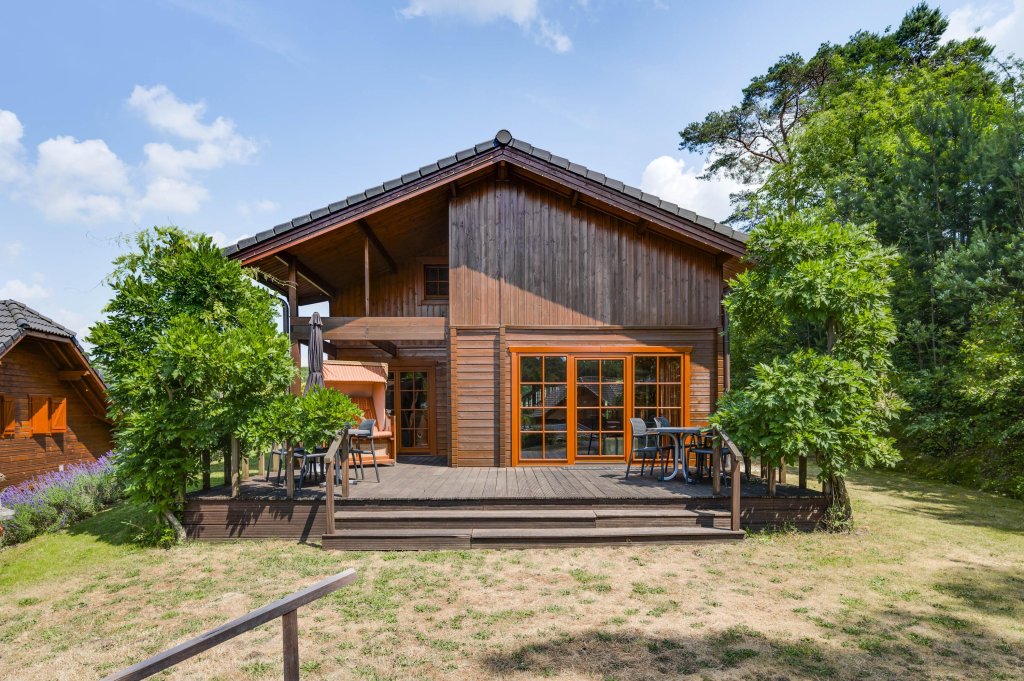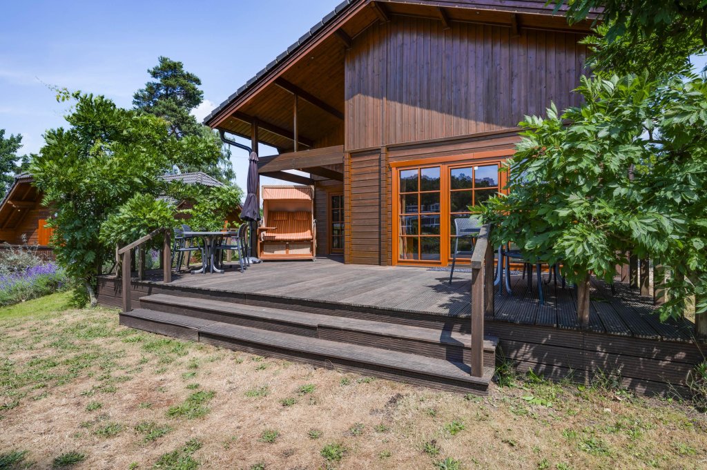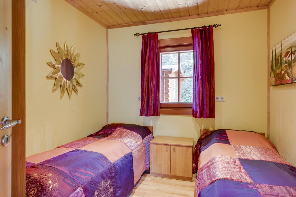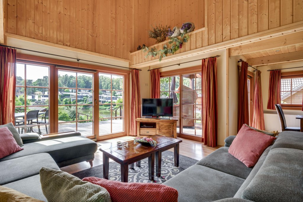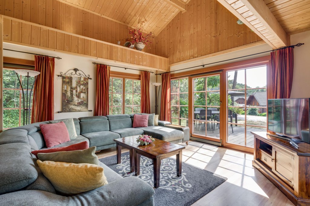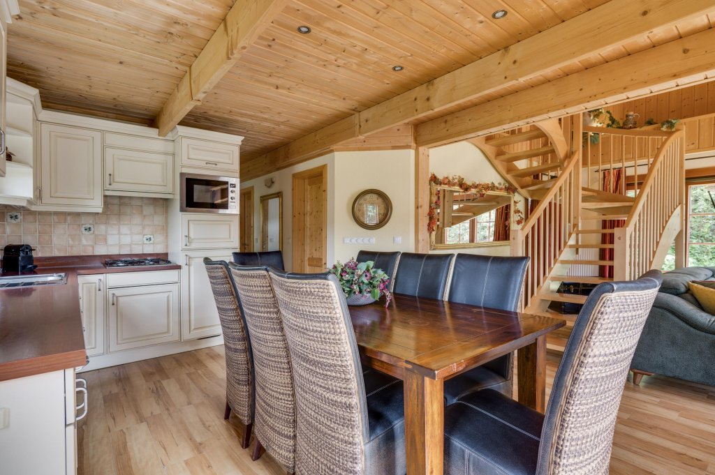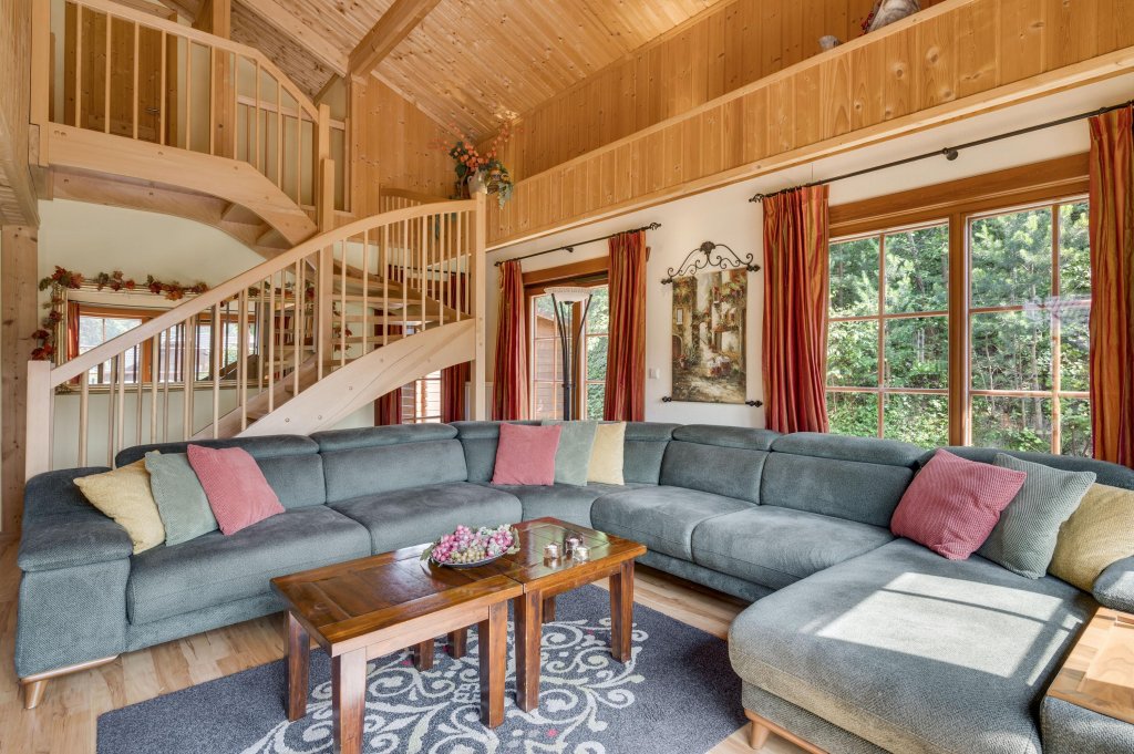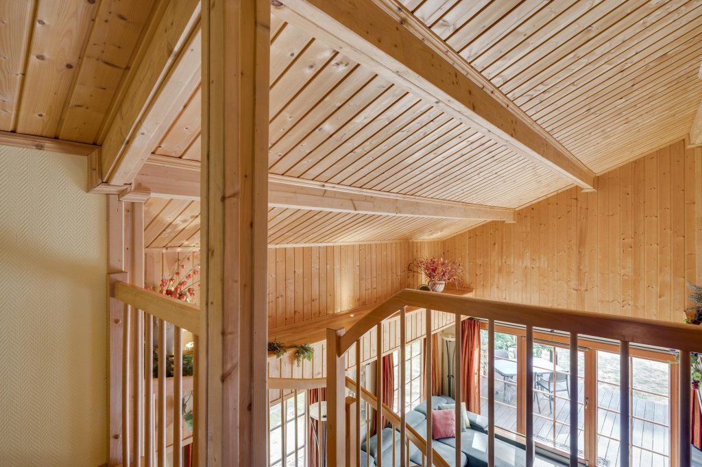 Destijds hebben de eigenaren tijdens de bouw gekozen voor een open woonkamer met vide wat een ruimtelijk gevoel geeft en hierdoor zich ook onderscheidt ten op zichte van andere recreatiewoningen. Tevens komt dit de constructie van het dak ook zeer ten goede en geeft het een extra dimensie aan de uitstraling van het chalet.