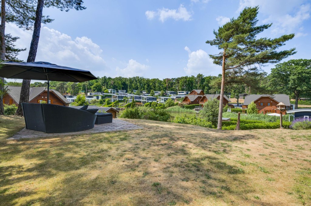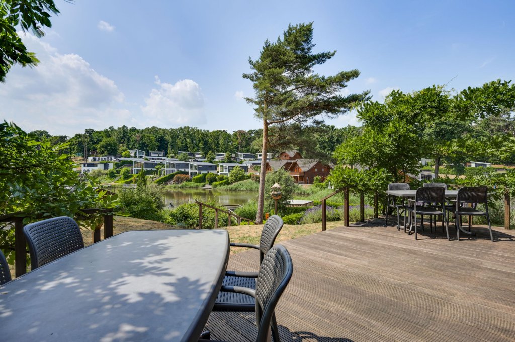 Recreatiewoning is vrij gelegen op eigen perceel, voorzien van oprit, tuinhuis en groenstroken met beplanting. Overdekte entree voorzien van berging (alwaar standplaats meterkast en C.V. - ketel). De woonkamer (ca. 27m²) kent veel lichtinval en staat nauw in contact met de rondom gelegen tuin en de zwemvijver vanwege de vele raampartijen. Dat maakt o.a. de ligging van deze recreatiewoning zeer geliefd. De keuken (ca. 14m²) met moderne keukeninstallatie is voorzien van de navolgende inbouwapparatuur, te noemen: 4-pits gaskookplaat; vaatwasser; koelkast; combi-magnetron; afzuigkap. Achterzijde van de recreatiewoning bevindt zich een mooi zitgedeelte en laat u heerlijk genieten van de prachtige omgeving. De aanwezigheid van het royale houten (deels overdekt) terras en het beklinkerd terras maken dit voor u mogelijk.