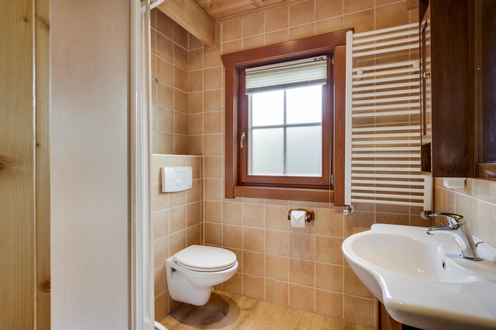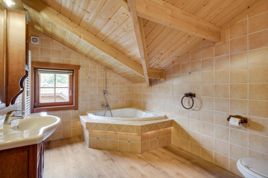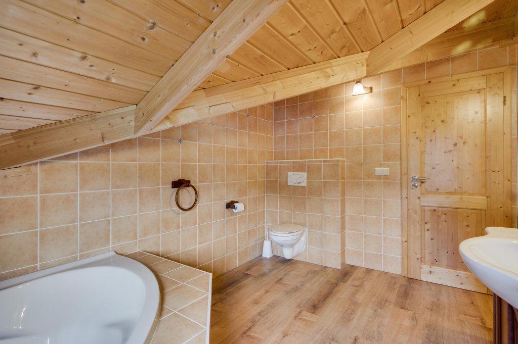De moderne badkamer (ca. 9m²) is voorzien van een ligbad, wastafel en toilet.