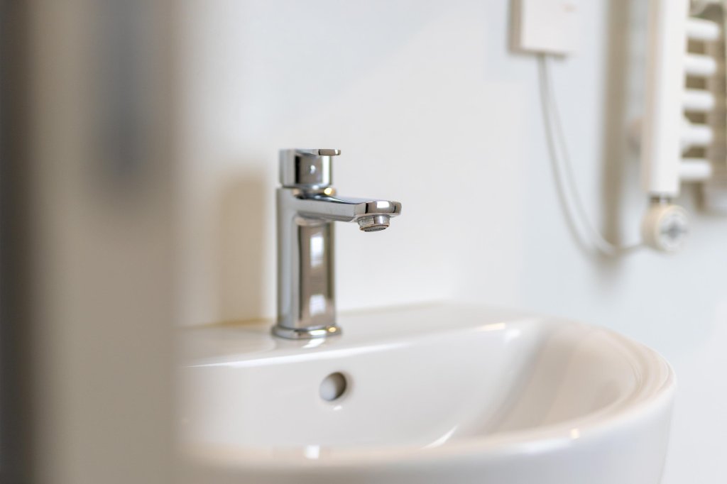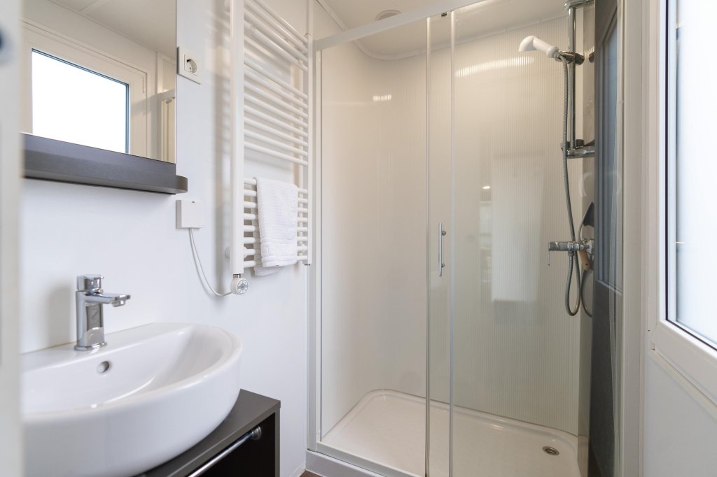 De badkamer beschikt over een douche, wastafel en toilet.