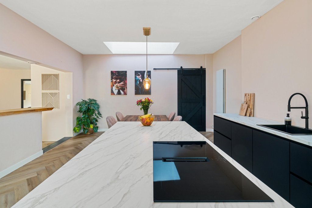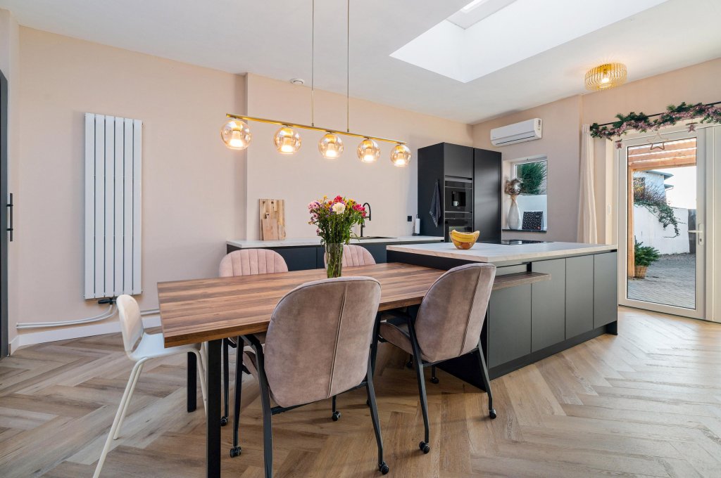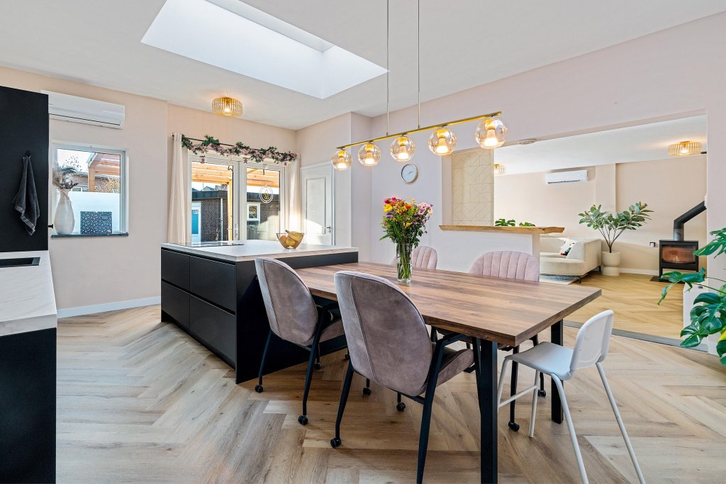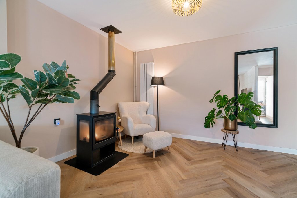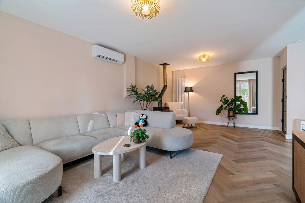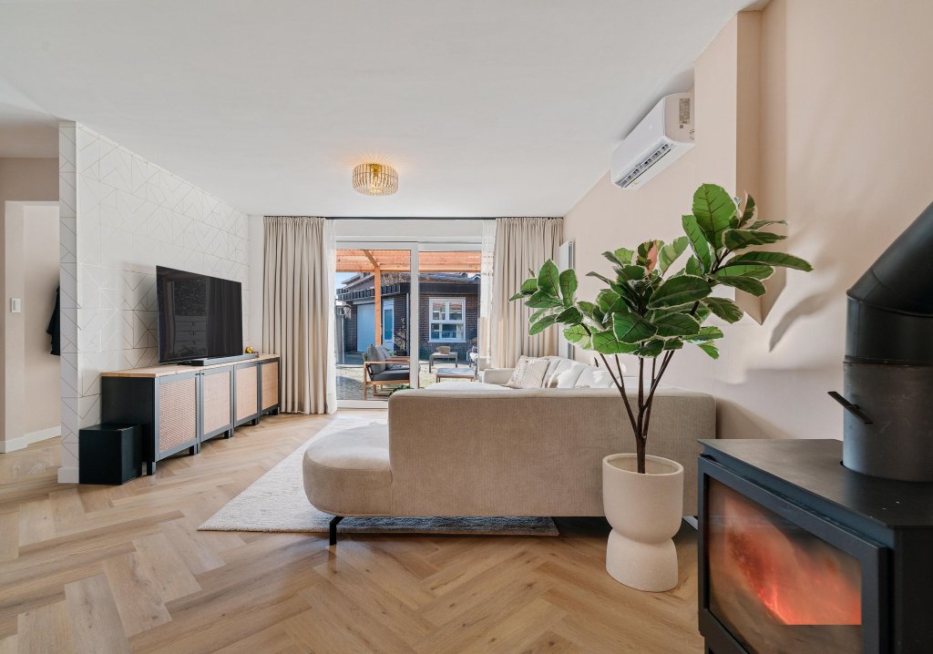 Via openslaande deuren betreedt u de geheel vernieuwde leefkeuken: een heerlijke, lichte ruimte met een modern kookeiland, uitgerust met de navolgende A-kwaliteit inbouwapparatuur: koelkast, vriezer, vaatwasser, close-in boiler, koffiemachine, oven met airfryer functie en 4-pits inductiekookplaat met geïntegreerde afzuiging. Tevens is de keuken voorzien van een airco en biedt het toegang tot de bijkeuken, de woonkamer en de garderobe met meterkast. De woonkamer heeft een prettige lichtinval door een riante schuifpui en een light tube. Daarnaast is de woonkamer voorzien van een sfeervolle houtkachel en een airco. Vanuit de woonkamer is de hal toegankelijk welke toegang geeft tot de drie slaapkamers, beide badkamers en de wasruimte/stookruimte.