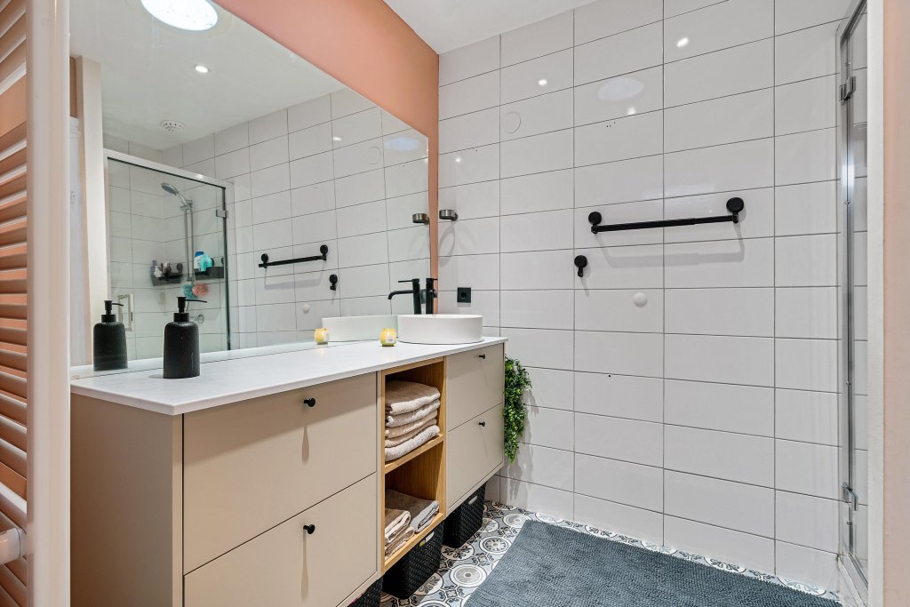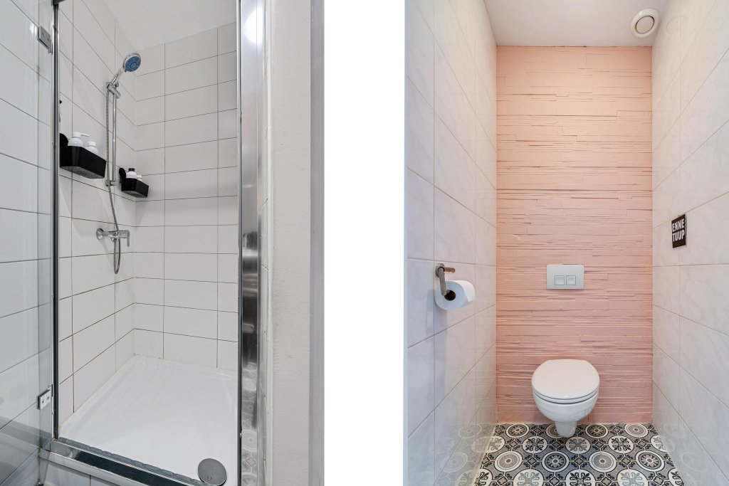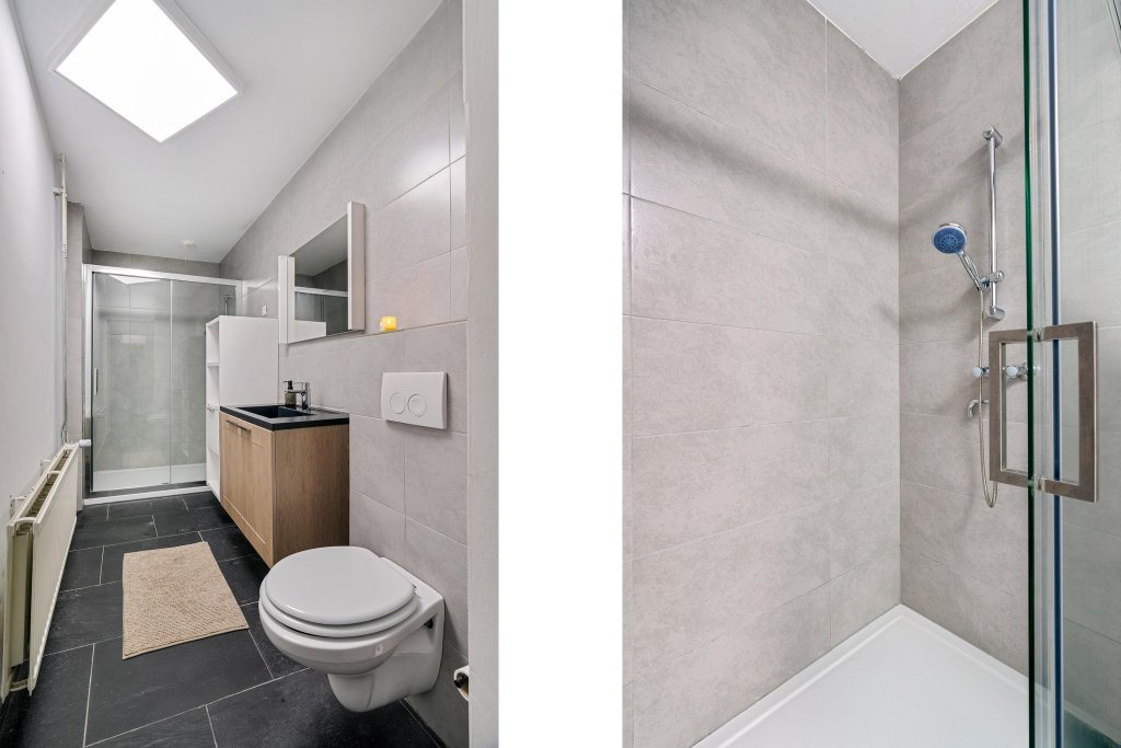 De tweede badkamer is voorzien met een douche, een toilet en een wastafel met meubel.