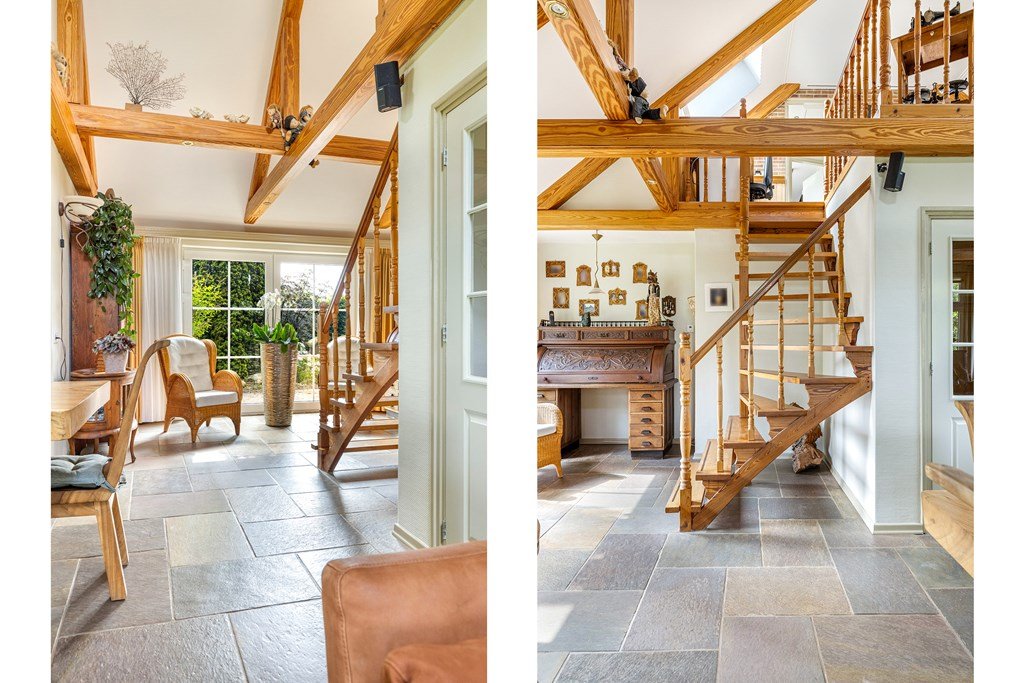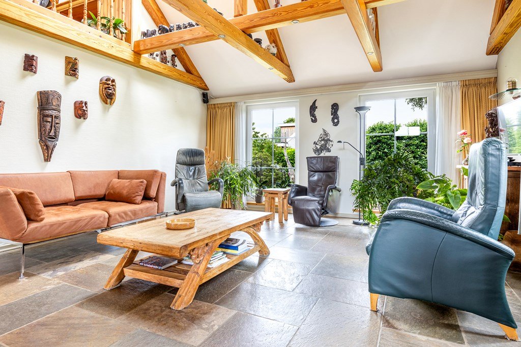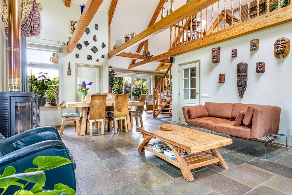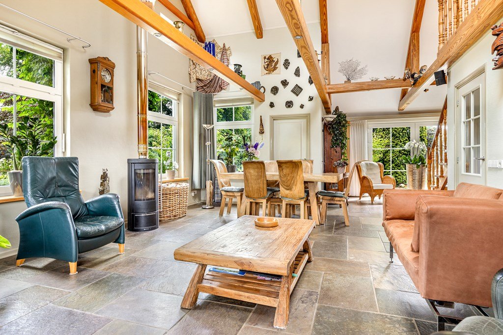Op de begane grond vinden we o.a. een zeer ruime woonkamer met vide en een plafond tot in de nok. Er zijn veel ramen, waardoor er veel lichtinval is. De woonkamer met openslaande deuren naar het terras, kijkt uit op de prachtige tuin, heeft een leistenen tegelvloer met vloerverwarming en een houtkachel. Hier is ook de trap naar de vide en de toegang naar de kelder.
