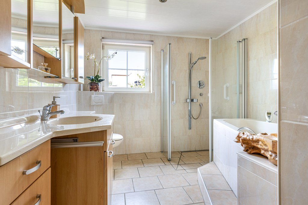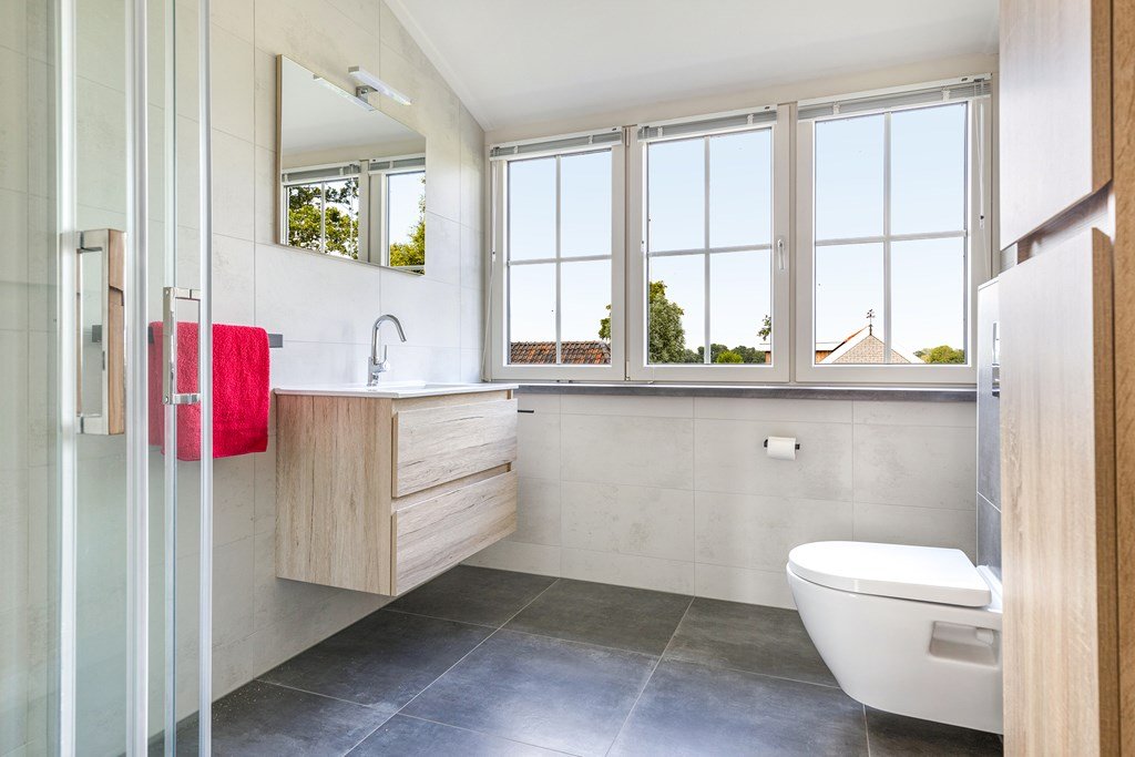 De woonkeuken, massief eiken, heeft een inductiekookplaat, vaatwasser, koelkast, combi-oven en een close-in boiler voor direct warm water. Ook daar vloerverwarming.