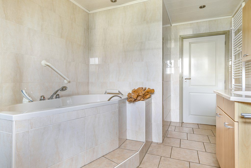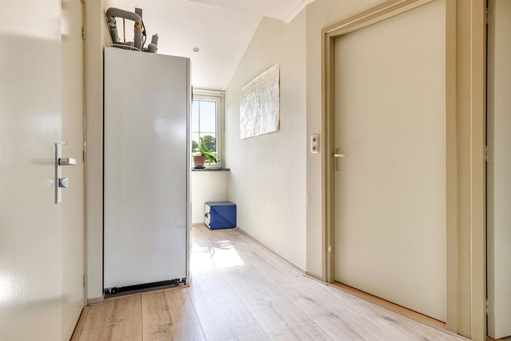 Bij binnenkomst door de voordeur betreedt je een royale hal. Aan de rechterkant de garderobe, meterkast, toilet en deur naar keuken en kamer. Verder in de hal aan de rechterkant inloopkast, badkamer met toilet, wastafelmeubel, inloopdouche en ligbad met whirlpool. Daarnaast een hobbykamer welke grenst aan de volledig betegelde bijkeuken. In de bijkeuken staat de 25Kwh thuis accu opgesteld en de witgoed aansluitingen. Ruime slaapkamer bevind zich aan de laanzijde.