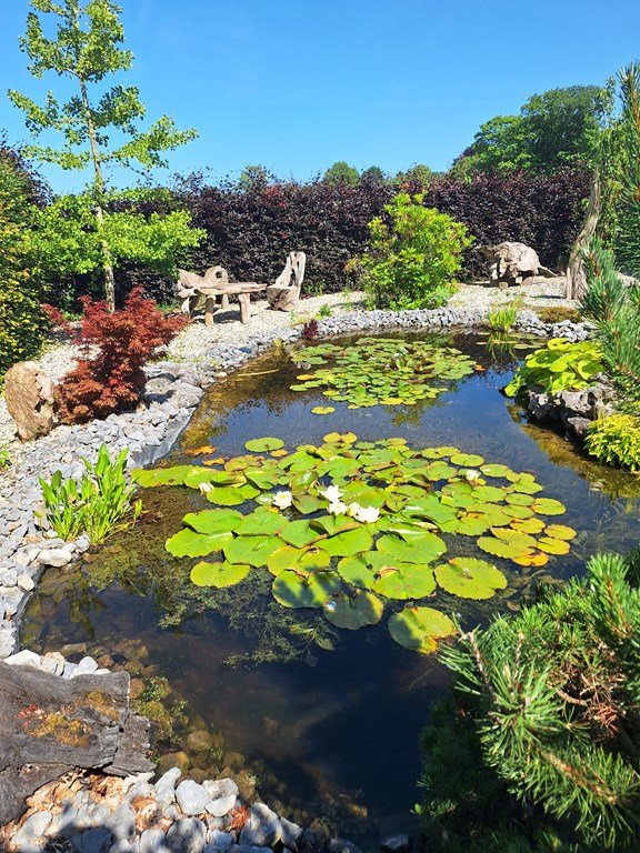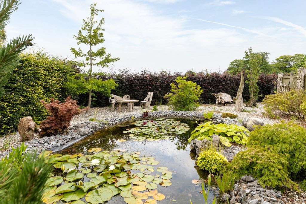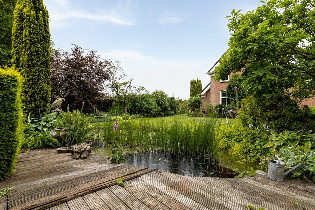 Rondom de woning is een prachtige tuin met grote kweekkas. De tuin is ideaal voor liefhebbers van natuur en buitenleven en is in verschillende delen opgesplitst. Hierdoor heb je overal weer een nieuwe kijk en maakt de tuin speels en aantrekkelijk, ook met de verschillende ornamenten. De sfeervolle vijvers vormen het hart van de tuin en trekt vogels en vlinders aan, wat zorgt voor een levendige en rustgevende sfeer. Voor de hobby tuinder is er een grote kas met fruitbomen, die perfect is voor het zelf kweken van groenten, kruiden of bloemen. Daarnaast is er een eigen waterbron geslagen voor het sproeien/watergeven in kas en tuin.