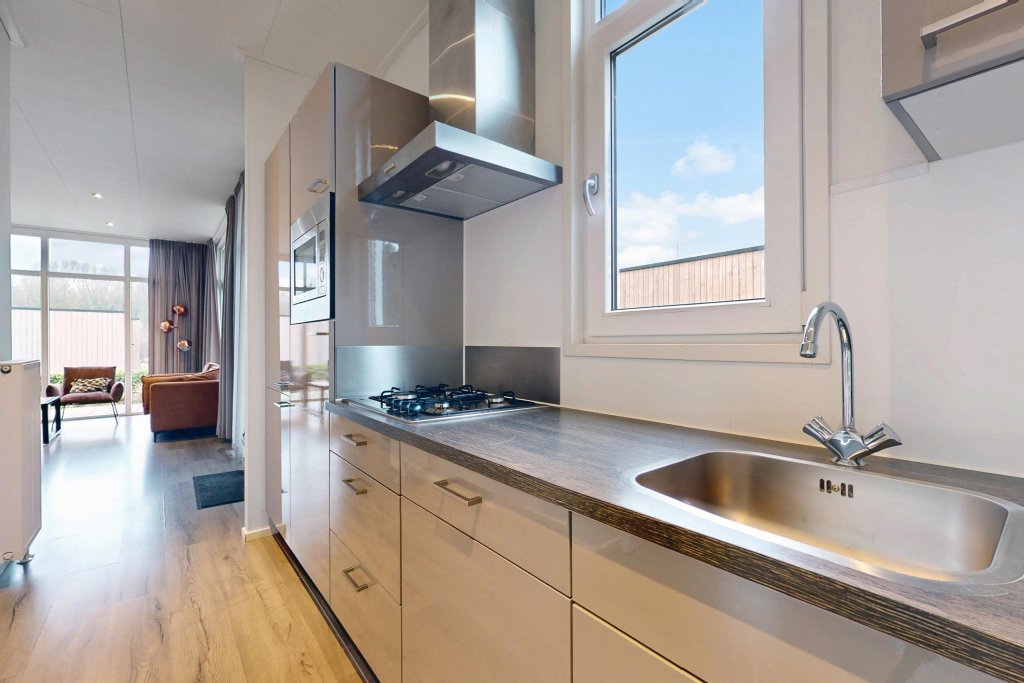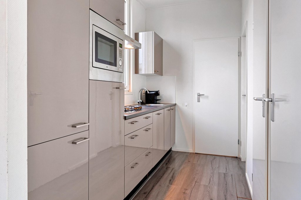 Bij binnenkomst betreed je de lichte en gezellige woonkamer van ca. 3,83 m breed en 5,45 m diep. De open keuken is voorzien van een gaskookplaat, oven, afzuigkap, koelkast en een vaatwasser.