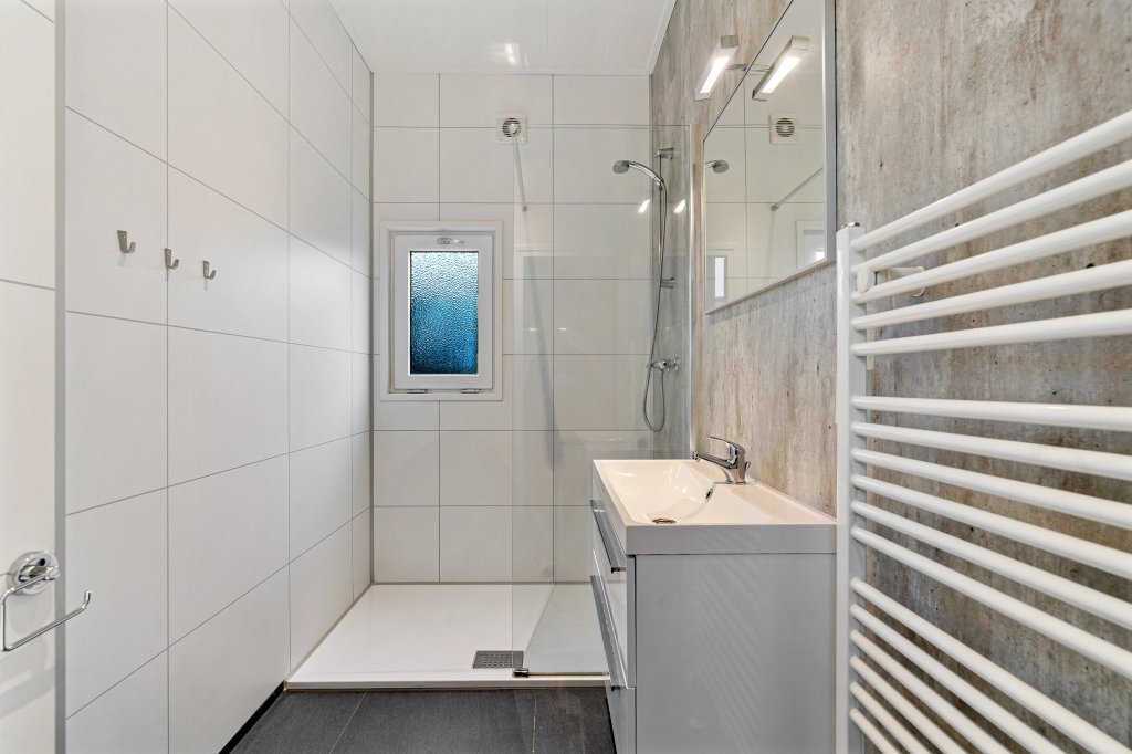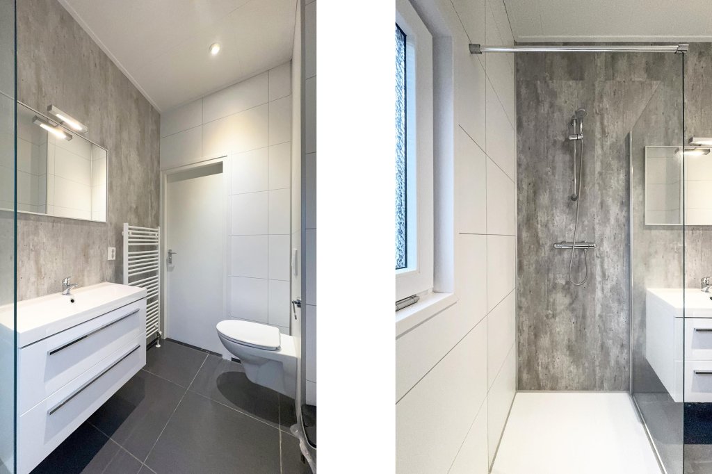 De moderne badkamer is voorzien van een douche, wastafel en toilet wat bijdraagt aan het comfort van de woning.