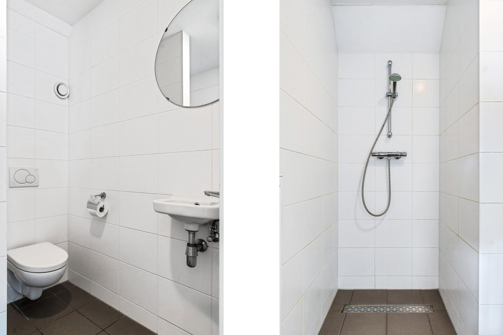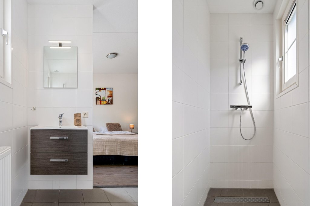 Bij binnenkomst betreedt u de royale hal/entree met aan de rechterzijde de meterkast en links een handige berging/technische ruimte met de CV-ketel. Direct aan de hal grenst een betegeld toilet met fonteintje, een badkamer met inloopdouche en wastafelmeubel, en een praktische slaapkamer op de begane grond.
