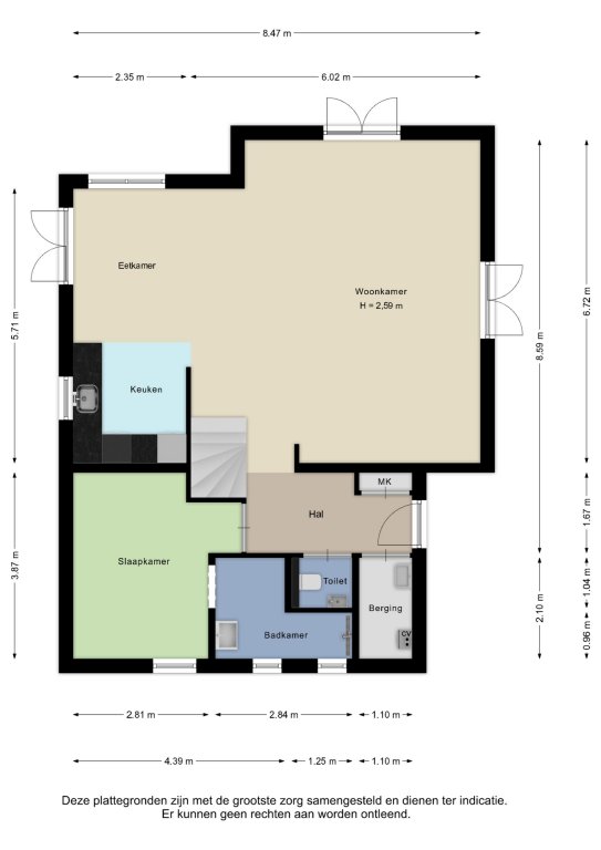 Alle door ons kantoor verstrekte informatie omtrent onroerende zaken, moet beschouwd worden als een uitnodiging om in onderhandeling te treden, en is geheel vrijblijvend! Alle vermelde maten en afmetingen zijn slechts bij benadering. Aan deze beperkte info kunnen geen rechten worden ontleend. Indien in enige documentatie of op enige website informatie staat die niet overeen komt met de werkelijkheid, dan geldt de feitelijke situatie waarin de woning zich bevindt, zoals koper deze tijdens de bezichtiging heeft kunnen waarnemen, en wordt de woning in deze feitelijke situatie/staat verkocht. Een (eventueel) bijgevoegde plattegrond dient uitsluitend als globale indicatie/visualisatie. Hieraan kunnen uitdrukkelijk geen rechten worden ontleend.