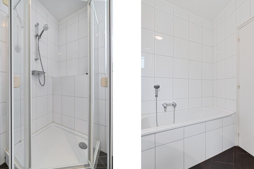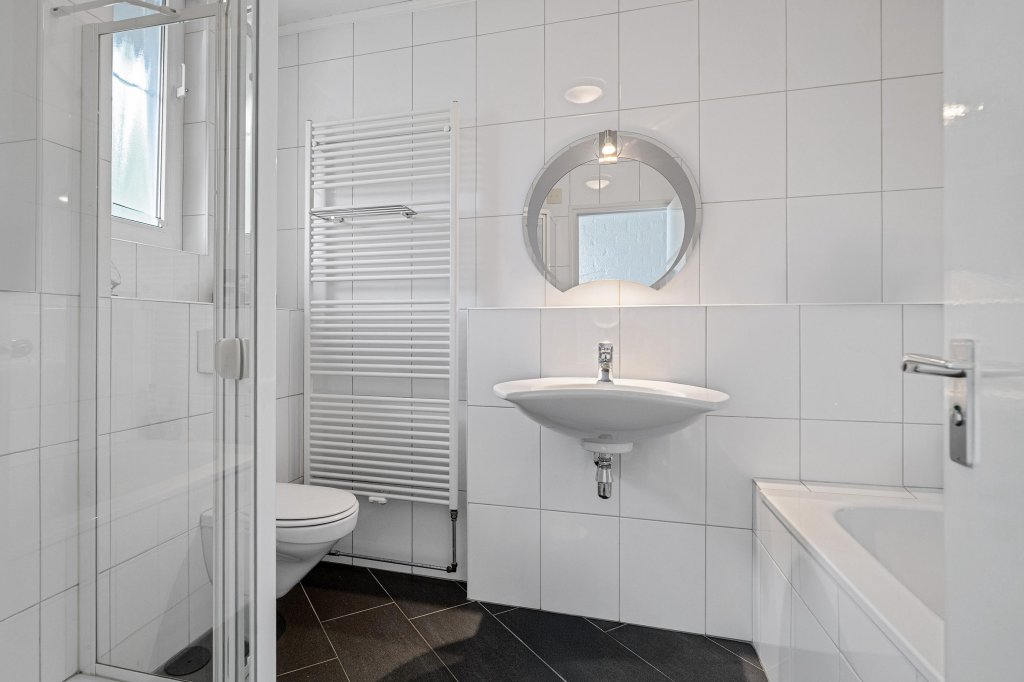 -Badkamer met een ligbad, douche, tweede toilet, designradiator en een wastafel.